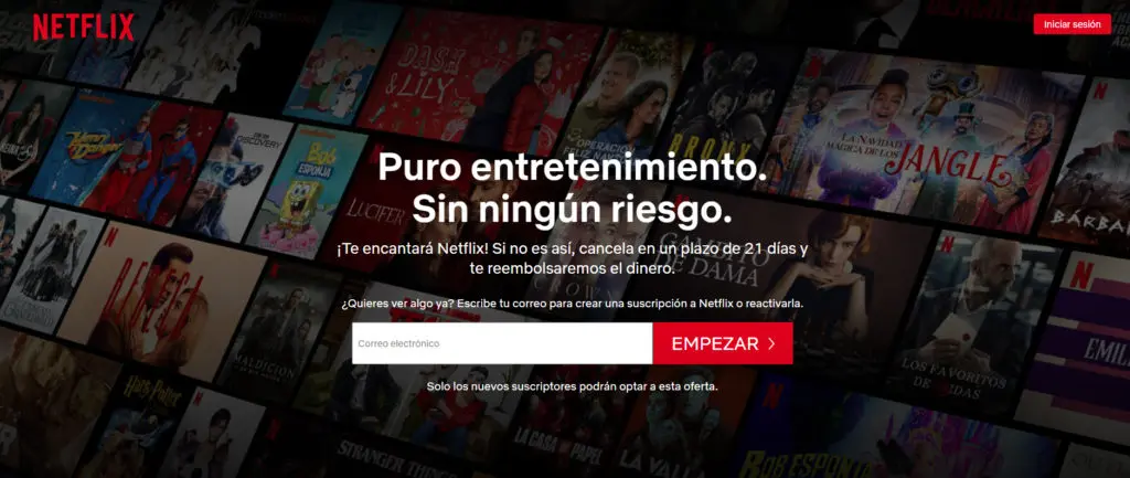 El primer ejemplo de landing efectiva lo tenemos con Netflix. Un titular sencillo que nos transmite la idea que ofrecen. Imágenes relacionadas con sus contenidos y un formulario sencillo en el que únicamente tenemos que introducir nuestro correo electrónico.