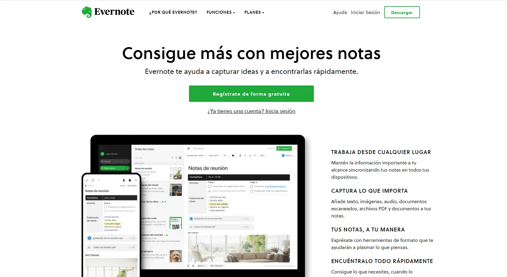 Otro ejemplo de landing page perfecta es el de Evernote. Ofrece todas las posibilidades que hacen que esta aplicación destaque sobre su competencia y una llamada de atención clara para que nos registremos de forma completamente gratuita.