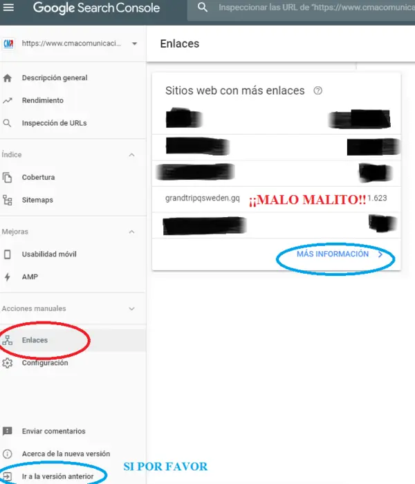 Voy a explicar Search Console (con la versión nueva, ole yo) porque está a disposición de todo el mundo, es gratis y siendo igualmente válido para nuestro objetivo, parece la mejor opción para hacer nuestra guía disavow.