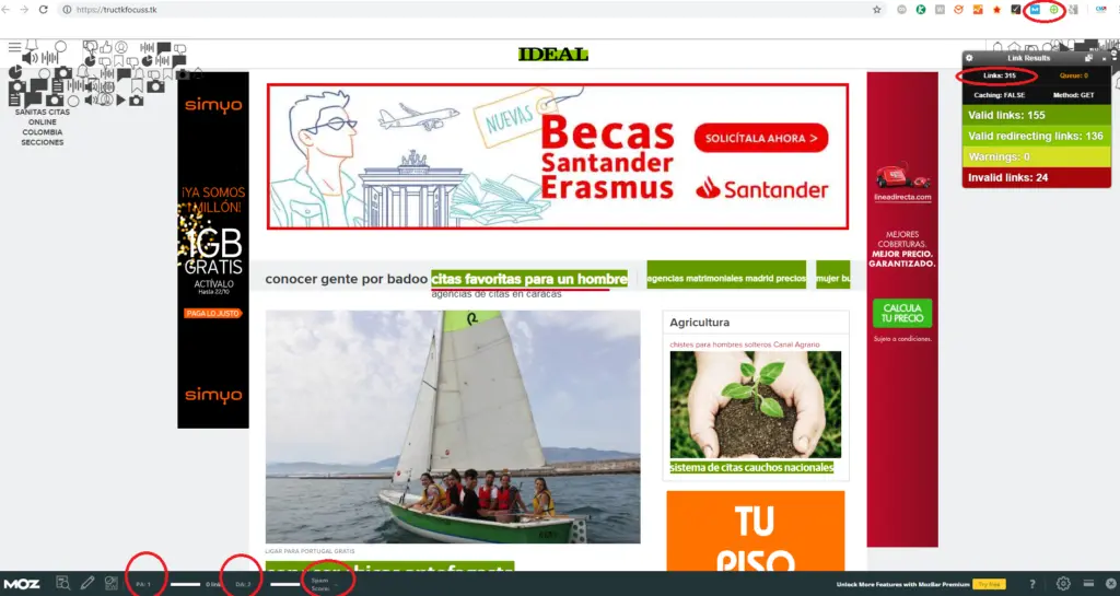 Sin embargo, podemos igualmente acudir a la web y analizarla con infinidad de extensiones de Chrome como Domain Hunter Plus, Page Analytics y con MOZ para ver el Domain Autorithy (DA), Page Autorithy (PA) y el Spam Score.