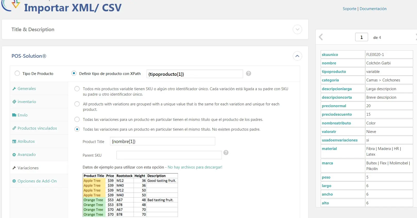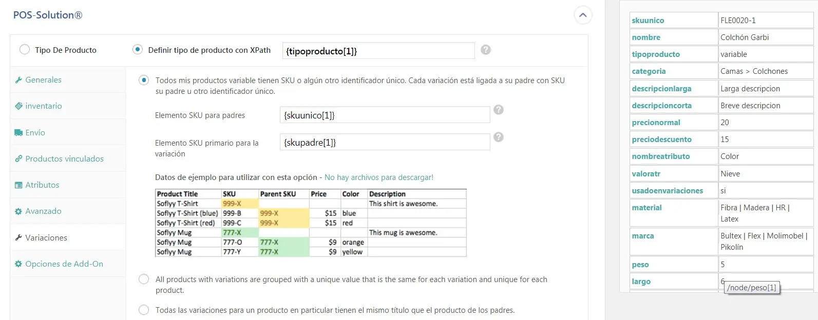 Sin embargo, nos encontramos con que no hay producto padre creado. Esto implica que la casilla del Parent SKU quedará vacía. La solución es que WP all import cree el producto padre automáticamente al importar las variedades, ¿Cómo? En POS-Solution-Variaciones, y dejándolo todo como en la siguiente captura: