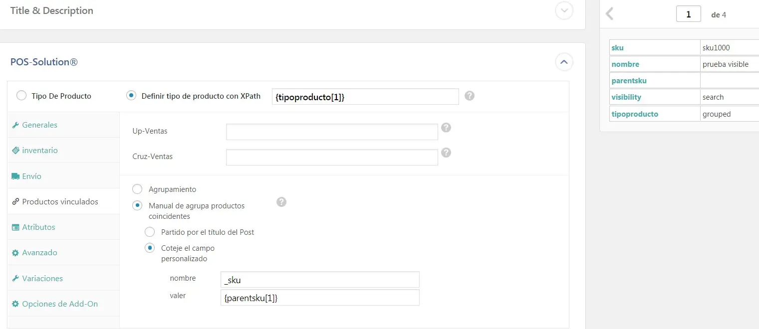 Después, dentro del propio importador de WP all import, hemos de señalar en POS Solution – Productos vinculados – Manual de agrupa productos coincidentes – Coteje el campo personalizado. Aquí, ponemos _sku en nombre y la columna de parent SKU en valer.
