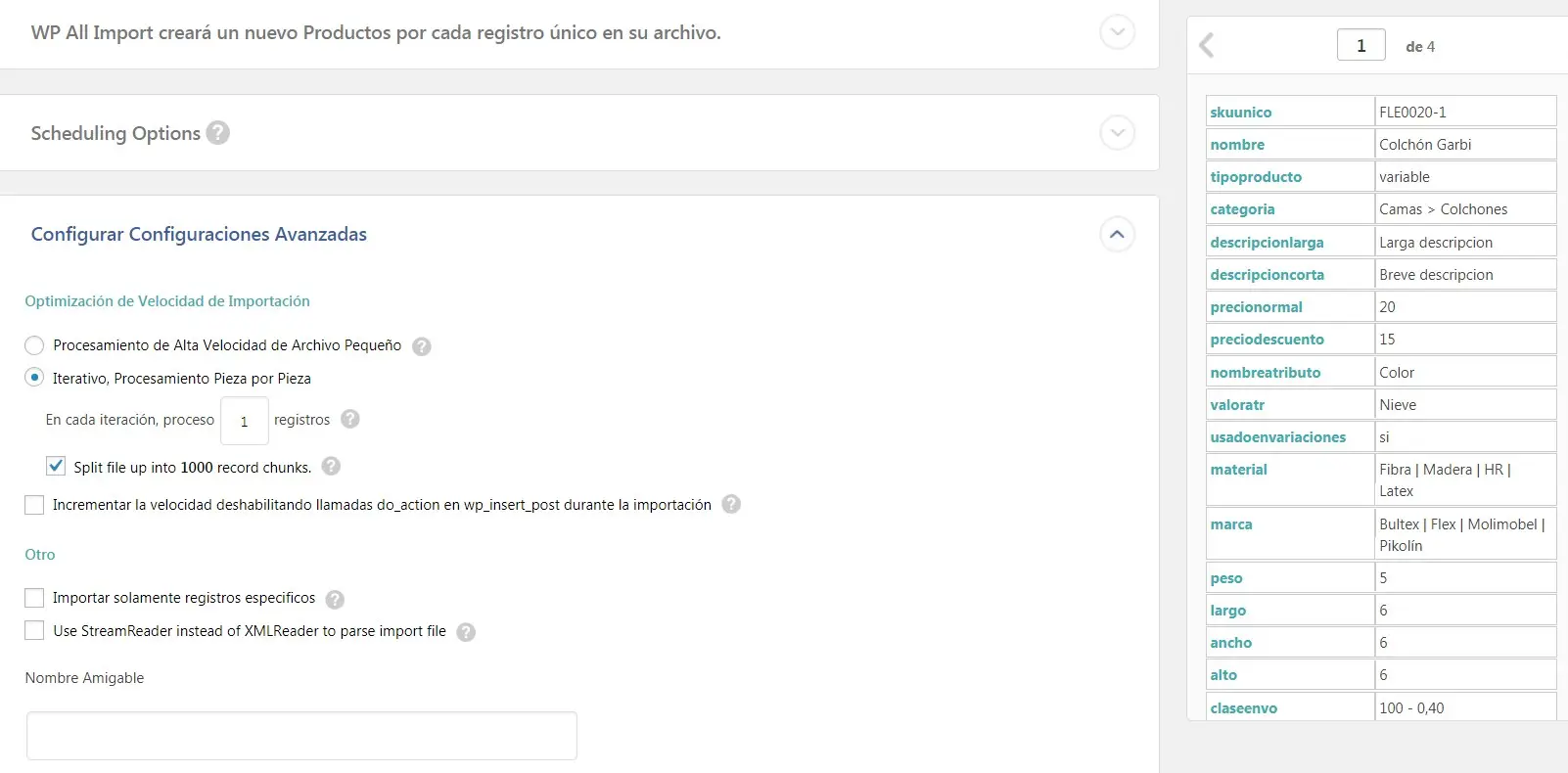 2 En el paso 4 de la importación de WP all import vamos a Configurar Configuraciones Avanzadas – Optimización de Velocidad de Importación – Iterativo – y ponemos ‘En cada iteración, proceso 1 registros’ para que vaya creando producto por producto. Así, cuando llegue al simple, el padre estará creado.