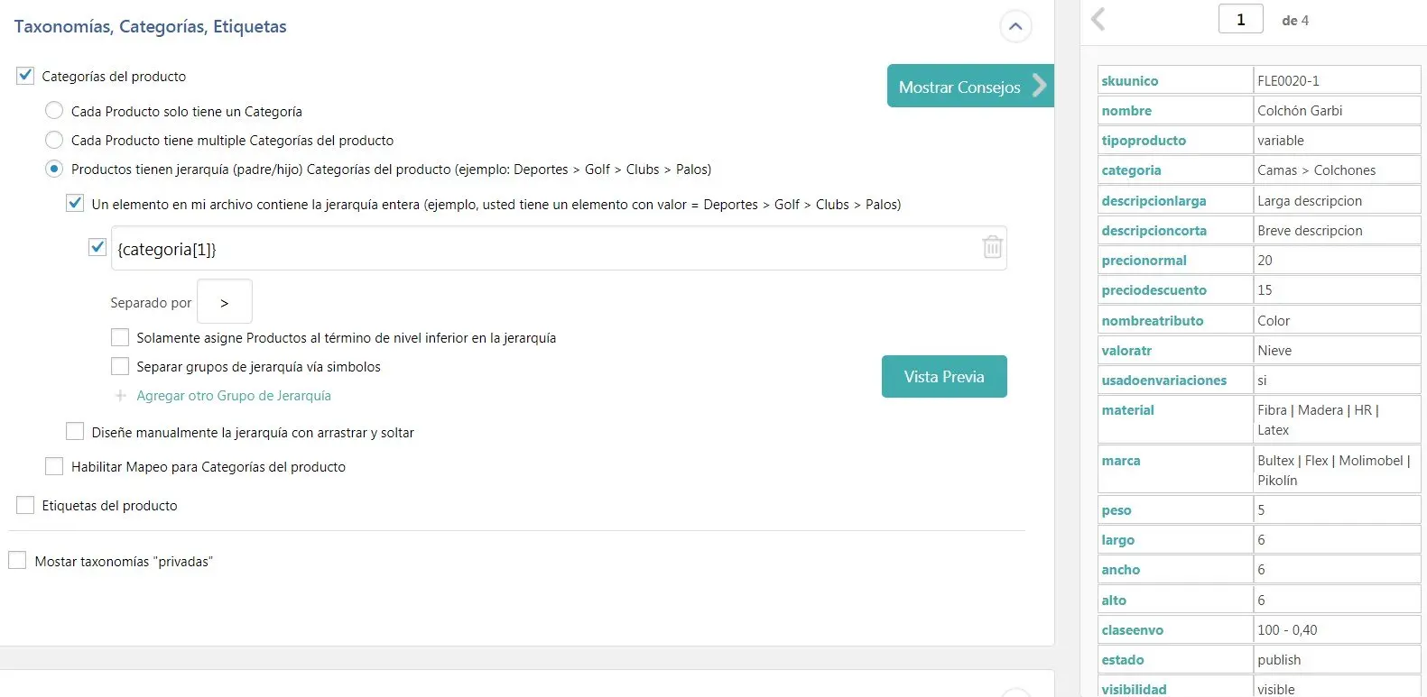 Si lo que tenemos es un montón de productos que pueden ser agrupados, las columnas del Excel y los pasos a seguir en WP all import serán diferentes: