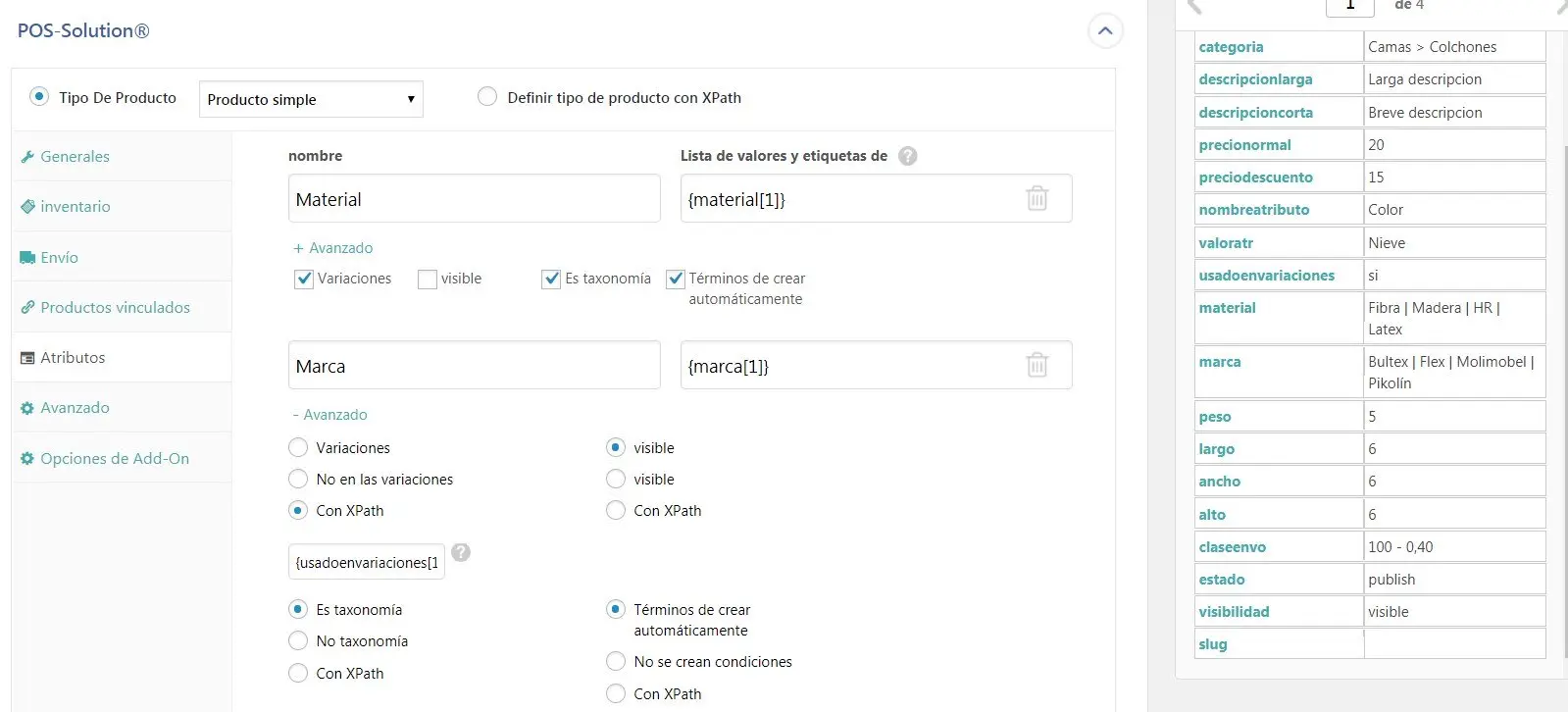 También, cuando metemos los valores, podemos configurar cada uno para decidir si los queremos visibles o no así como si queremos que se utilicen para variaciones. Igualmente podemos hacerlo desde el Excel creando una columna para esto. Para elegir estas opciones vamos a POS Solution-Atributos.